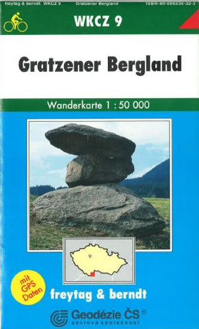 Folded hiking map of Gratener Bergland (Novohradské Mountains), WKCZ 9. Legend in Czech, German, and English. Map is printed on one side. Comes with information, photograph, and index booklet in German.
