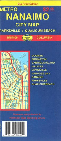 Folded city map of Nanaimo metro area, big print edition. One side covers Nanaimo from Gabriola Island to Lantzville with index. Reverse covers Nanoose Bay and Parksville Bay to Hilliers area with an inset of Nanoose Bay and continued index.