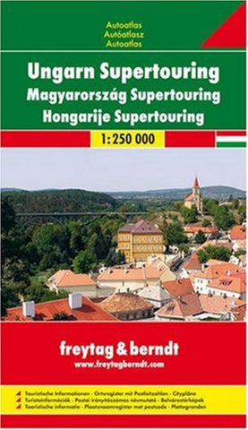 Road atlas of Hungary at 1:250,000 scale (2.5 km per cm). Map shows highways and roads, rail and ferry lines, airports, ports, distances in kilometers, natural features, parks, and places of interest. Transportation detail for regional Budapest, mileage chart, and highway speeds for European countries. Also included are detailed city maps for Budapest, Debrecen, Gyor, Miskolc, Pecs, Szeged, Bekescsaba, Eger, Kaposvar, Kecskemet, Nyiregyhaza, Salgotarjan, Szekesfehervar, Szekszard, Szolnok, Szombathely,Tatabanya, Veszprem, Zalaegerszeg, Baja, Balatonfured, Dunaujvaros, Esztergom, Godollo, Gyongyos, Gyula, Heviz, Hodmezovasarhely, Keszthely, Jaszbereny, Kiskunfelegyhaza, Koszeg, Mosonmagyarovar, Nagykanizsa, Papa, Siofok, Sopron, Szentendre, Tata, Vac, Sarospatak and Visegrad. Placename index in the back. Legend in Hungarian, Spanish, Italian, German, English, French and some Slavic languages.