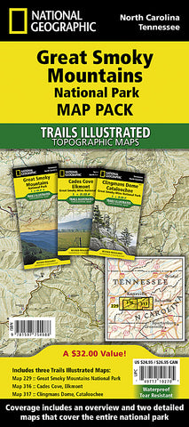 Great Smoky Mountains National Park is the most visited national park in the country. The Map Pack Bundle includes three maps to help visitors get the most out of their trip. The map pack includes an overview map that shows the entire park as well as two detailed maps of the east and west halves of the park. With this combination of maps visitors can feel comfortable planning a trip that includes driving the picturesque Cades Cove Driving Loop to hiking deep into the backcountry. All trails are marked with trail milage and all three maps include multiple points of interest such as quite walkways, campgrounds, boat launches, shelters and more.