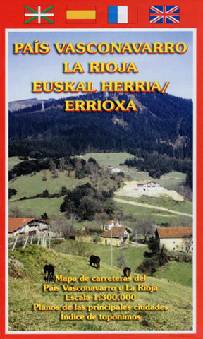 Folded road map of Pais Vasco-Navarro and La Rioja, Spain. Features photographs, index, and tourist information in Basque, Spanish, French, and English.