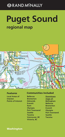 Regional map of the Puget Sound area, including insets of 12 cities, index of cities, index of streets, and index of points of interest.