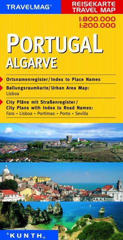 Road map of Portugal with legend, conventional signs and significant points of interest. Insets of Lisboa, Lisboa city center and Porto. On reverse main map continued with insets of Sevilla, Algarve, Faro and Portimao. Indices to streets, place names and points of interest accompany main map and insets.