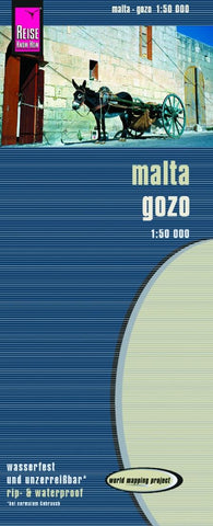 Road map of Malta and Gozo with legend and city index. Relief shown by contours and spot heights. Waterproof and tear-resistant. Printed on one side.