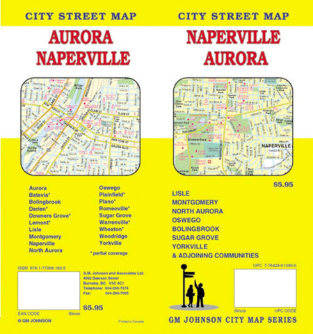 Folded street map of Aurora and Naperville, IL. Main map covers Yorkville up to Batavia with index. Reverse covers Bolingbrook to the edge of Wheaton with continued index and points of interest.