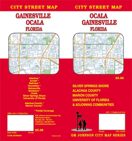 City map of Gainesville with legend, community, city, street and points of interest index. Inset of the University of Florida accompanied by index. On reverse city map of Ocala with continued index. Inset of Marion Oaks.