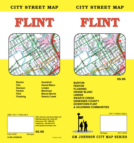 Folded street map of Flint. One side covers Swartz Creek and Flushing to Goodrich and Davison with inset of downtown. Reverse covers Montrose to Gennesee Recreation Area and inset of Linden/Fenton, with street index and points of interest.
