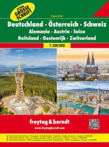 Spiral-bound road atlas of Germany, Austria, and Switzerland. Legend in German, Spanish, Dutch, English, French, and Italian. Extra large print. Includes index and features a section of city center maps in smaller scale.
