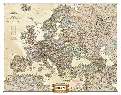 The Executive political map of Europe is a striking example of the cartographic excellence National Geographic is known for. The antique color palette, shaded relief, and easy-to-read fonts make this map both beautiful and functional. International boundaries are clearly defined and thousands of place names, waterbodies, airports, major highways and roads, national parks and more are included.