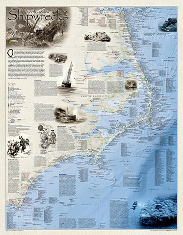 Shipwrecks of the Outer Bank illustrates more than 1,550 shipwrecks of the Atlantic Coast from Cape Henry, Virginia to Cape Fear, North Carolina. Each wreck site is symbolized to define the class, type and name of vessel accompanied by the date of sinking. Icons also indicate whether a ship was lost due to conflict or natural causes.