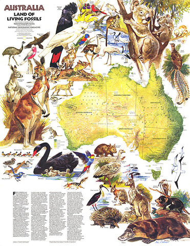 This beautiful physical map of Australia and Tasmania includes an introduction to the fascinating wildlife found throughout the continent. Published in February 1979 as a companion to the Australia map and the article Those Kangaroos! They're a Marvelous Mob.