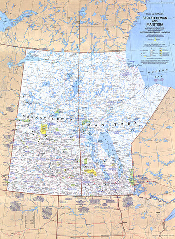 This travel map of the Canadian provinces of Saskatchewan and Manitoba shows hundreds of national parks, wilderness areas, campgrounds, and ski resorts. It also highlights points of interest in cities such as Winnipeg and Regina. Published in May 1979.