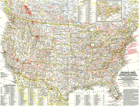 This map lets you discover the abundance and diversity of the lands, forests, memorials, and battle sites administered by the National Park Service. Includes Canadian parks with an inset map of New Brunswick, Nova Scotia, and Prince Edward Island. Published in May 1958 as half of a two–map presentation on national parks.