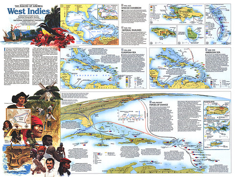 A region of contrasts, the islands of the West Indies are both tropical paradise and lands marred by a dark history of slavery, greed, and suffering. Part of the Making of America series, this work represents Side Two of a two-map set published in November 1987 and features an abundance of historical information about this culturally diverse region. Two articles, Searching for Columbuss Lost Colony: La Navidad and Haiti - Against All Odds, accompanied the two maps.
