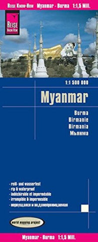Myanmar / Burma at 1:1,500,000 on an indexed, waterproof and tear-resistant road map with topographic and tourist information, published by Reise Know-How as part of their highly acclaimed World Mapping Project. The map is double-sided to provide the best balance between a good scale and a convenient size sheet, with a very generous overlap between the two sides. Coverage on the southern side extends east to Bangkok and south to Ko Samui and Surat Thani, indicating border crossings to Thailand.