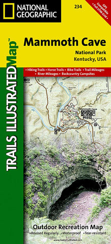 Mammoth Cave is a fascinating and beautiful labyrinth located below the equally scenic Green River valley and hilly country of south central Kentucky. National Geographic’s Trails Illustrated map of Mammoth Cave National Park delivers detailed and valuable information to assist you in your exploration of this unique and compelling region. Expertly researched and created in partnership with local land management agencies, this map features key points of interest including Green and Nolin rivers; First Creek Lake; Houchin Ferry; Turnhole Bend; Dennison Ferry; Maple Springs; and the cities of Brownsville and Park City. The print version of this map includes a detailed inset of the cave area, along with general information about the park and cave, as well as an inset of the historic entrance and vicinity.