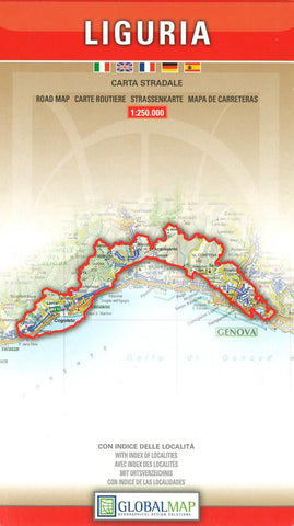 Folded road map of Liguria, Italy. Features multilingual legend and index on reverse.