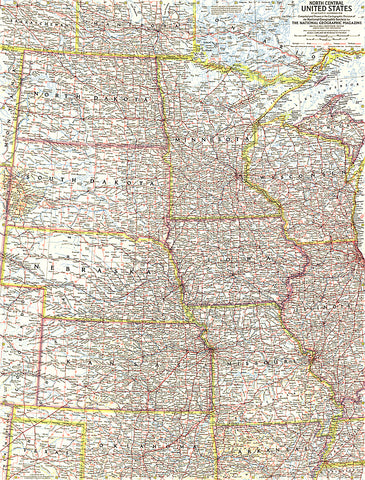 This map of the North Central United States details North Dakota, South Dakota, Minnesota, Nebraska, Iowa, Wisconsin, Illinois, Missouri, and Kansas. Published in November 1958 with article The Upper Mississippi, it is part of a series of six sectional maps of the United States published between 1958 and 1961.