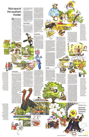 Published in October 1974, this poster entitled Arkansas, Oklahoma, Louisiana, Texas: Rich Land of the Southern Frontier is half of a two-piece set in the Close-Up: U.S.A. series, a companion to the South Central States map. With an overview of the beautiful and exciting vacations spots and sites to be seen in each of the four states, this work is a wonderful guide for travelers.